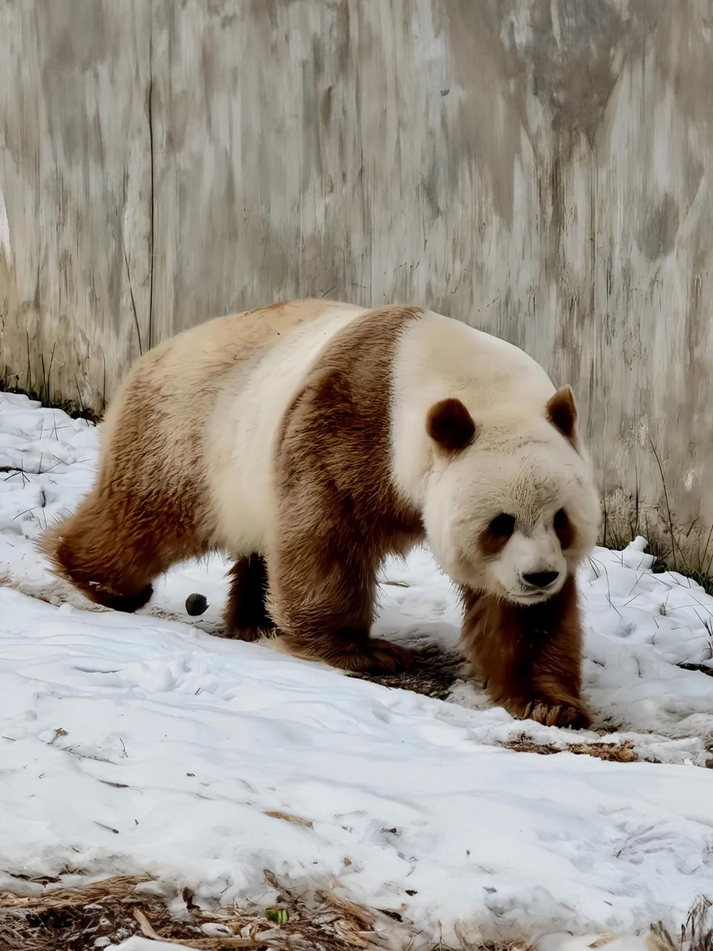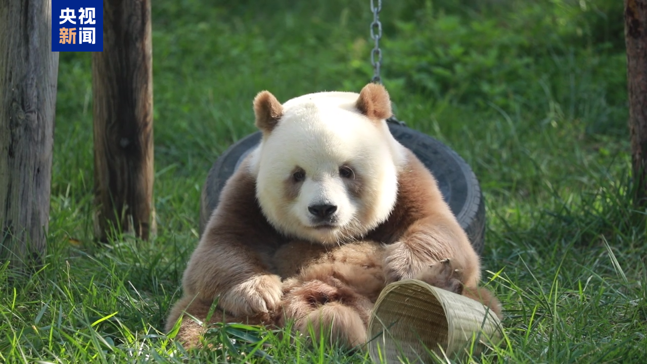 Qizai has an extremely rare brown-and-white coat, caused by a missing segment of DNA in the Bace2 gene. This subtle genetic variation affects pigmentation, resulting in an appearance distinctly different from that of typical black-and-white giant pandas.